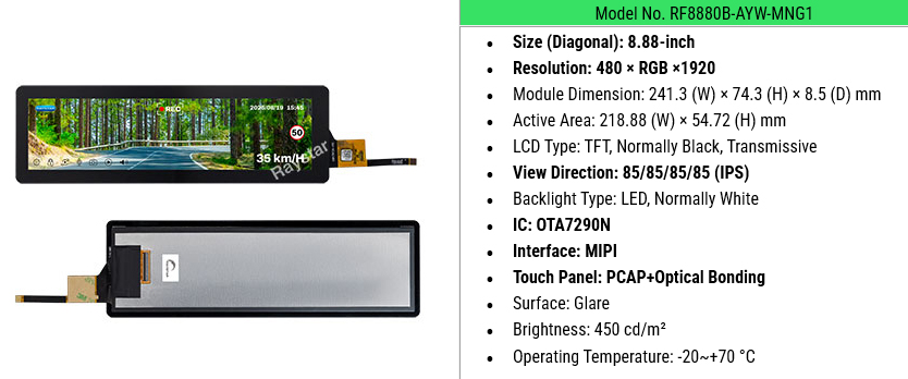 8.88-inch 480Ă—1920 MIPI IPS Bar Type TFT Module with PCAP+Optical Bonding